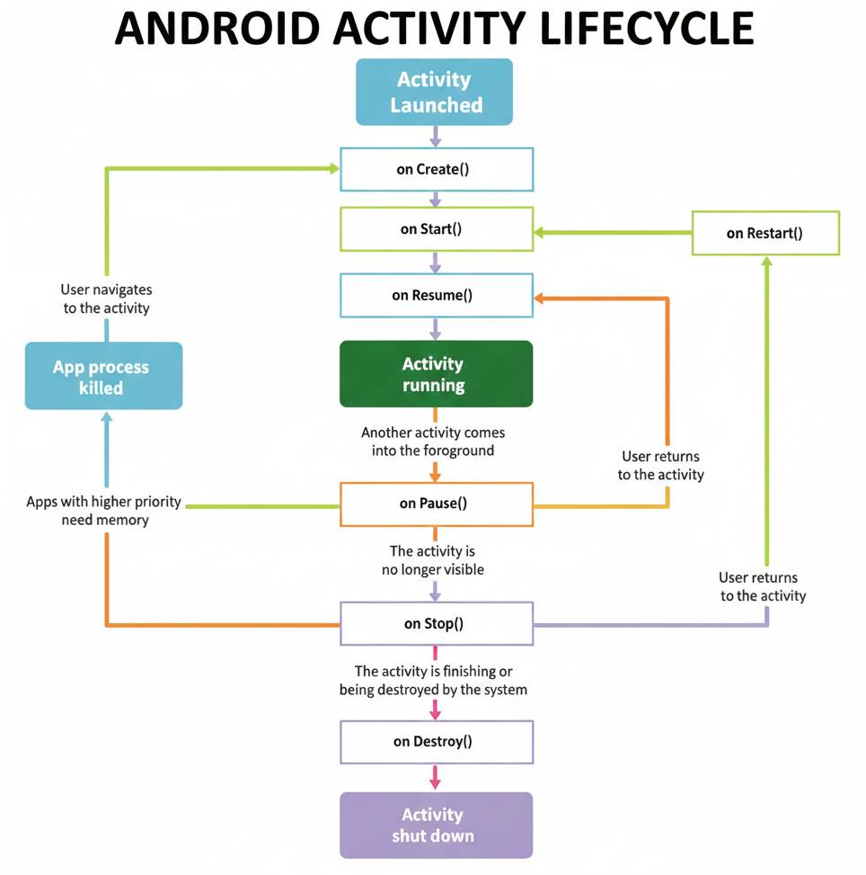 Imagine you're reading a book. Sometimes you're actively reading, sometimes you bookmark and put it aside, sometimes you close it completely. An Android Activity goes through similar states from when it's created until it's destroyed.